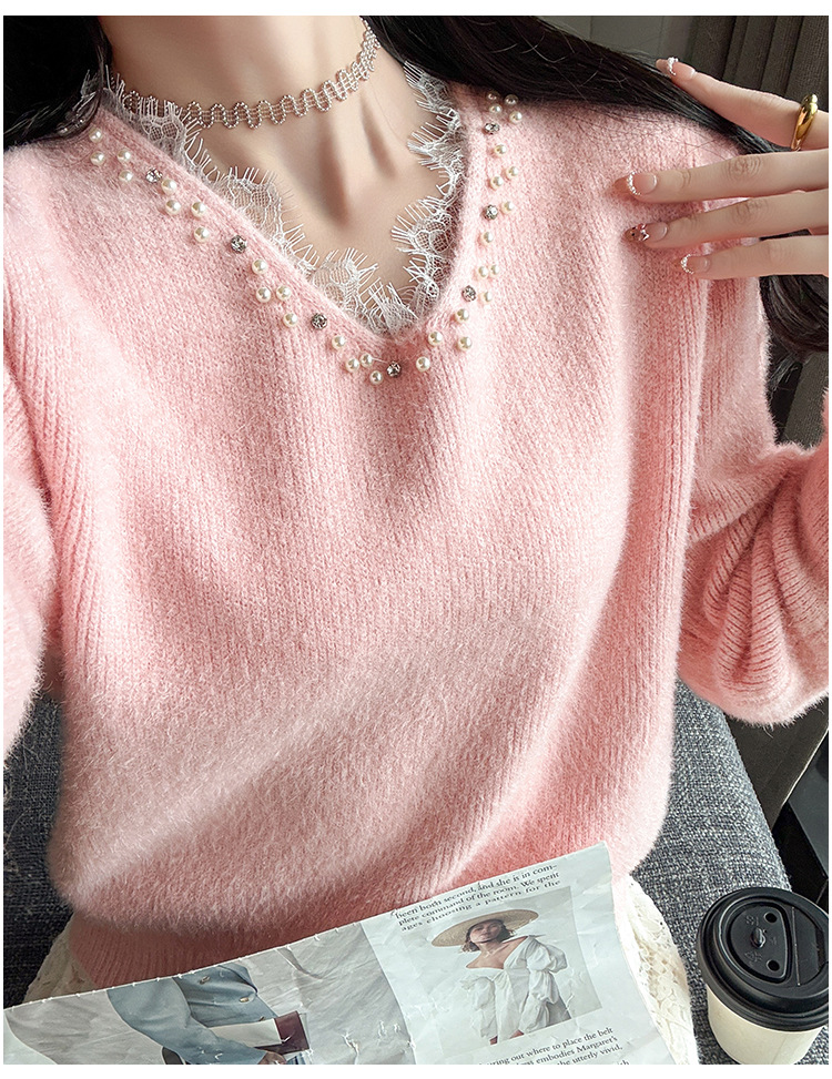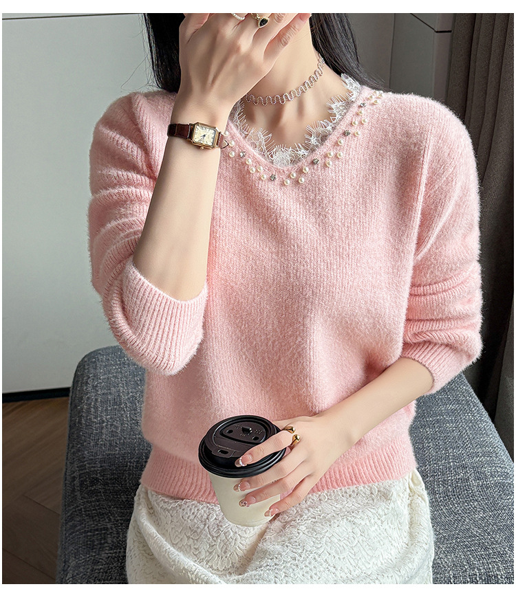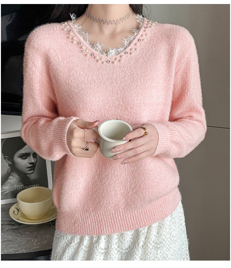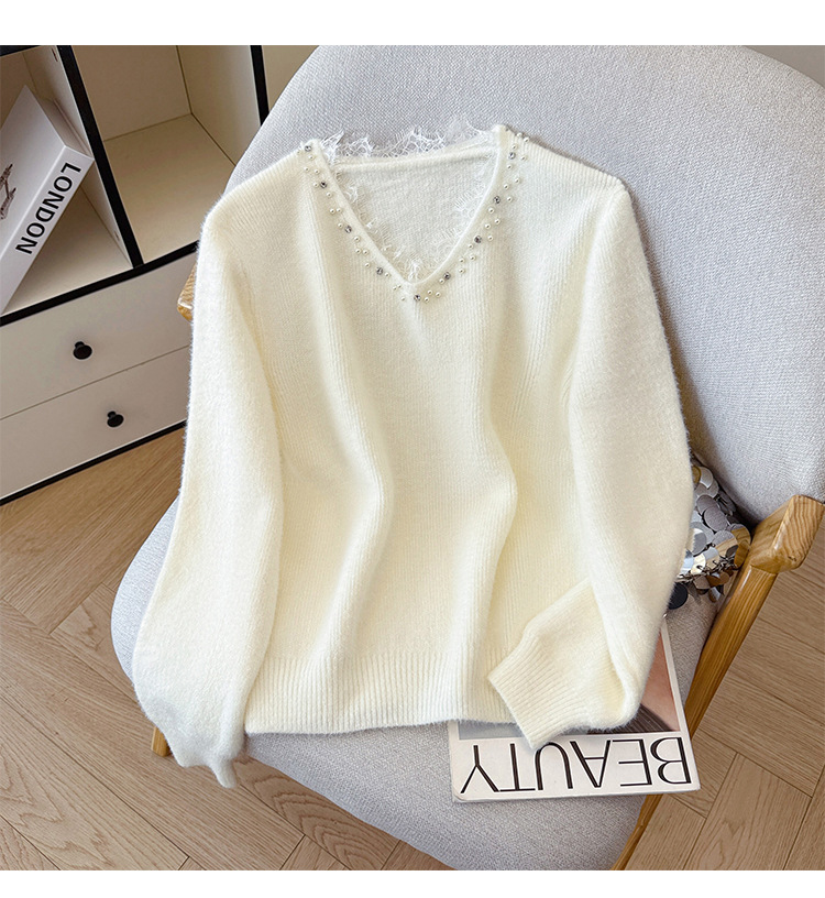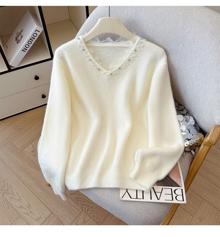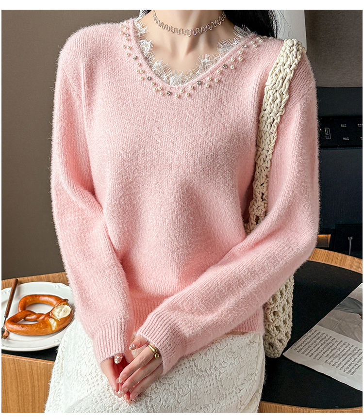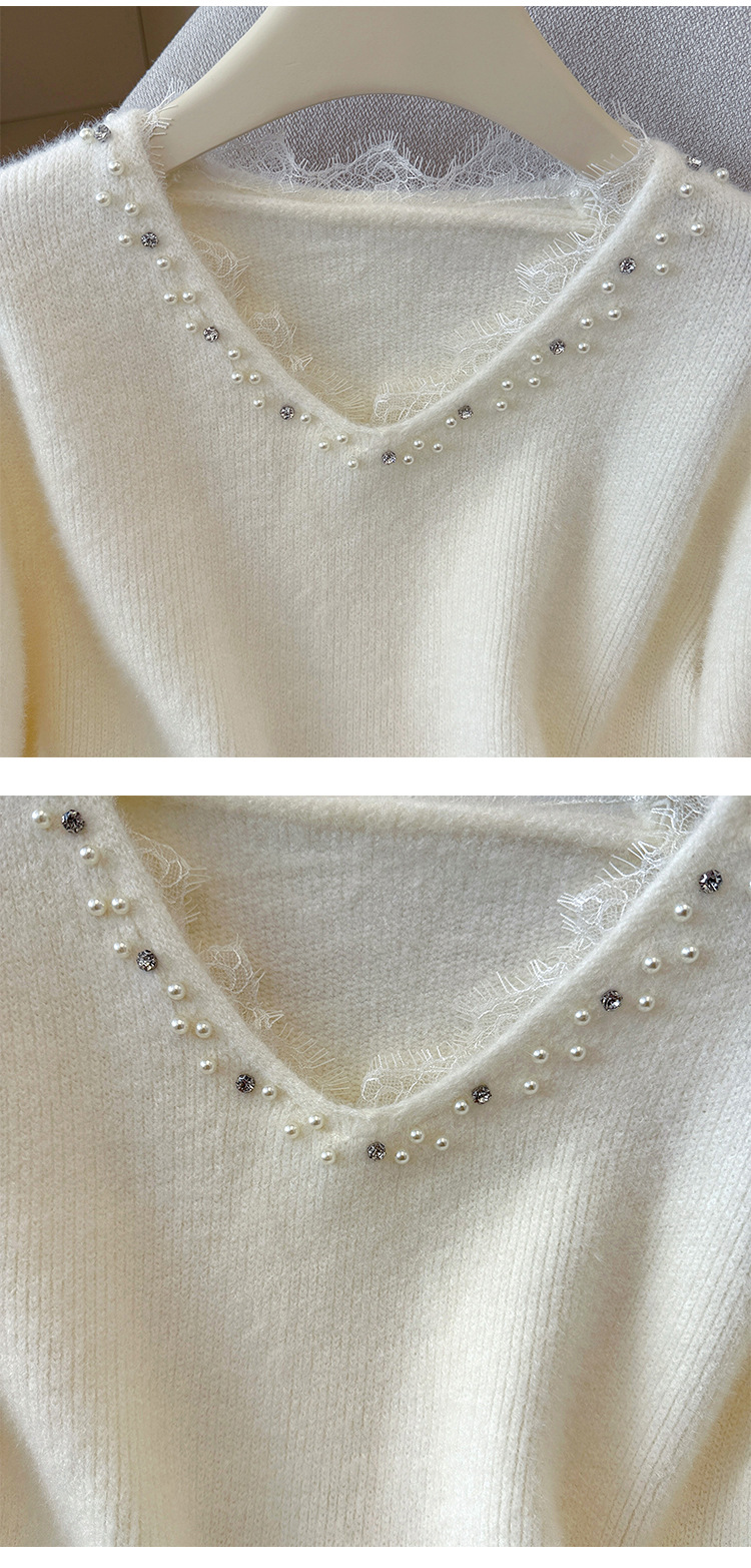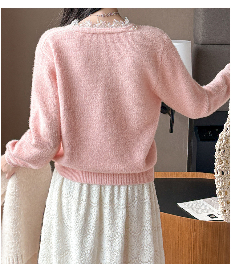 Beaded Lace Trim V-Neck Knit Cardigan for Women