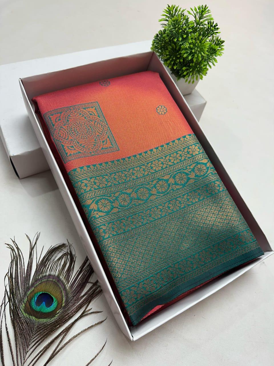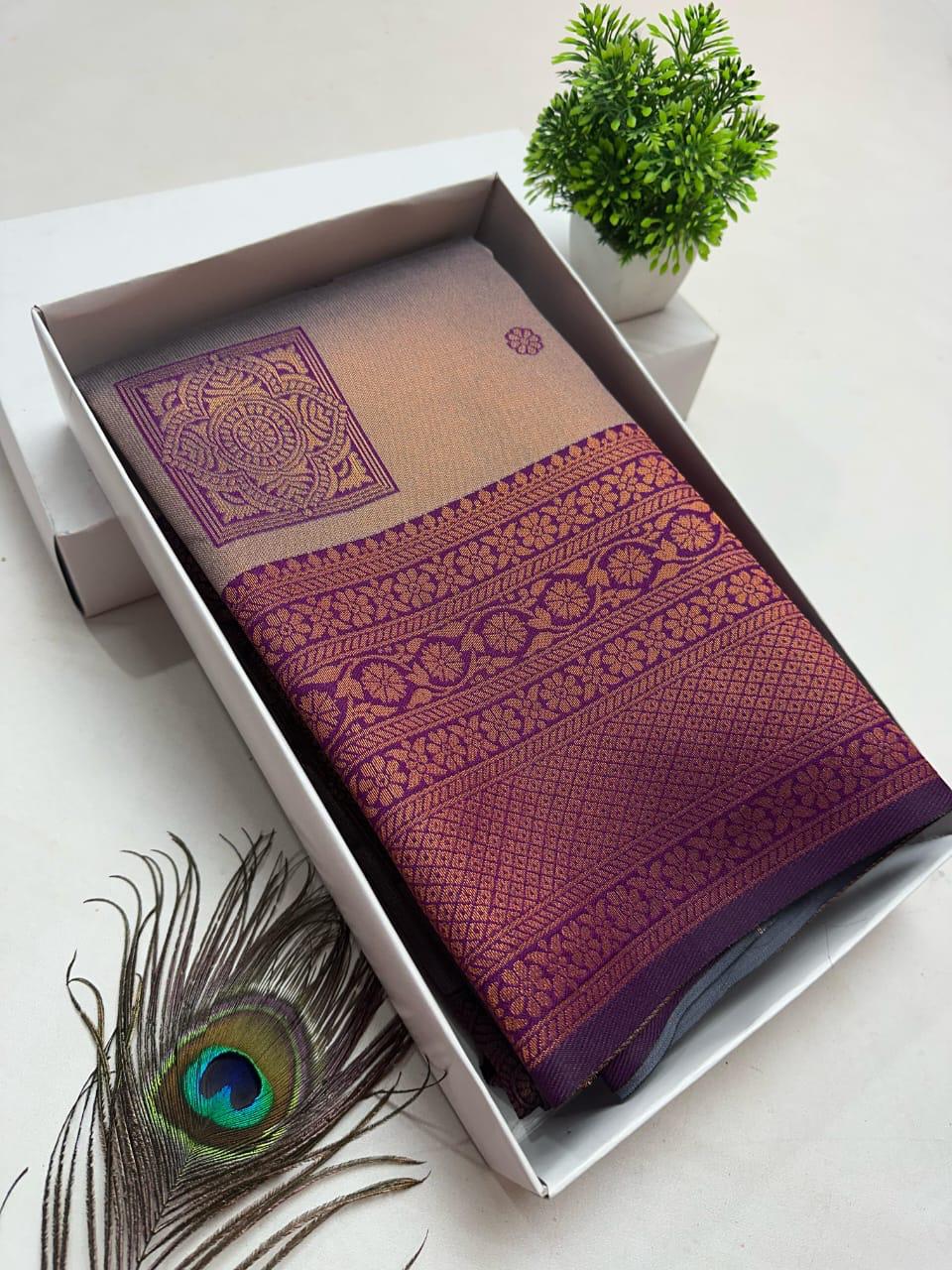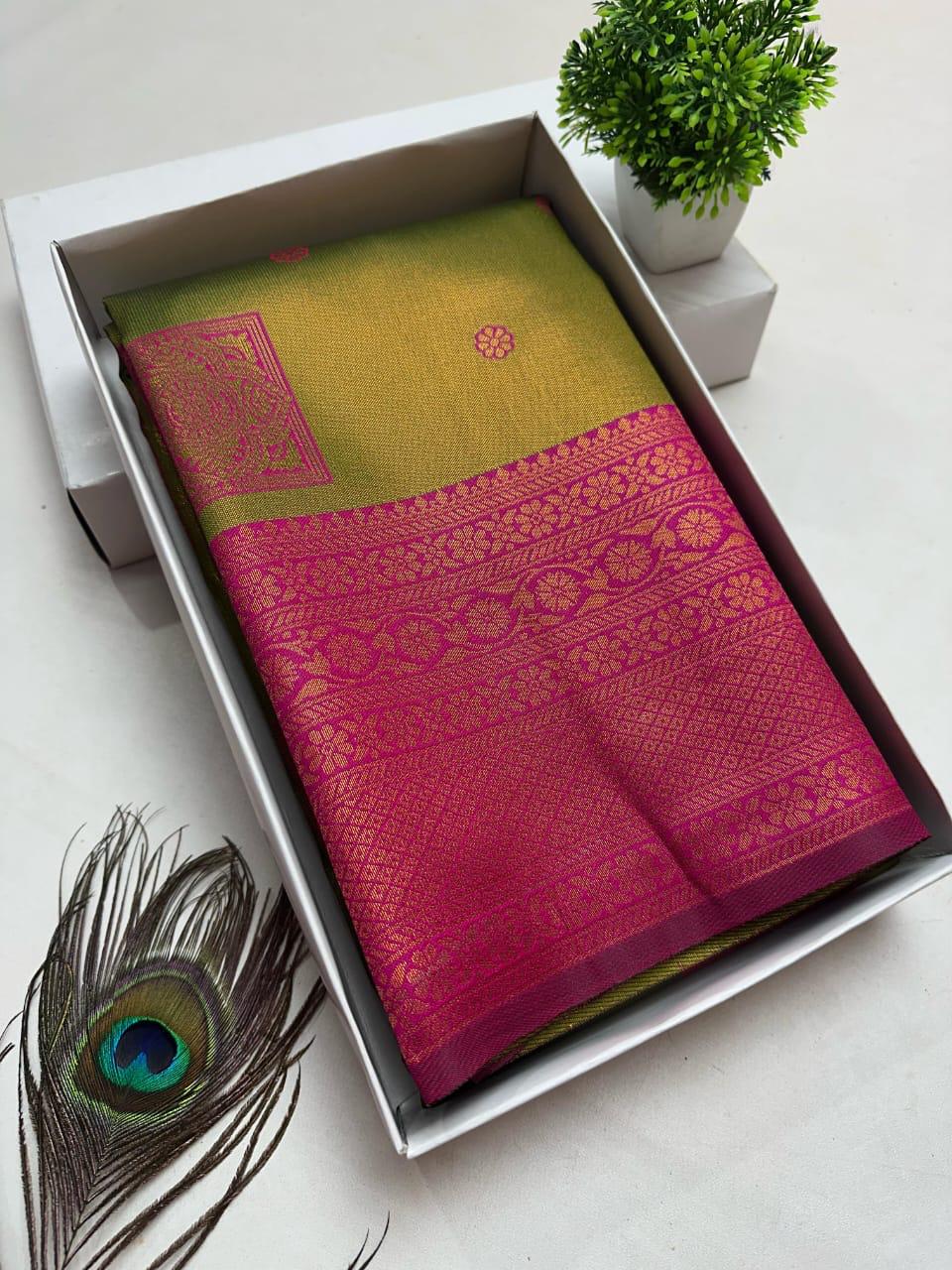 💫 Crafted with soft Banarasi silk, featuring a beautiful contrast border, rich zari pallu, and a brocade contrast blouse.
